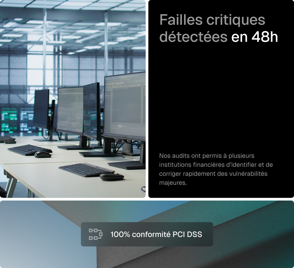 Nos services couvrent les audits de sécurité, les tests d’intrusion, le conseil en cybersécurité, la conformité réglementaire (PCI DSS, ISO 27001) et la formation certifiante des équipes.